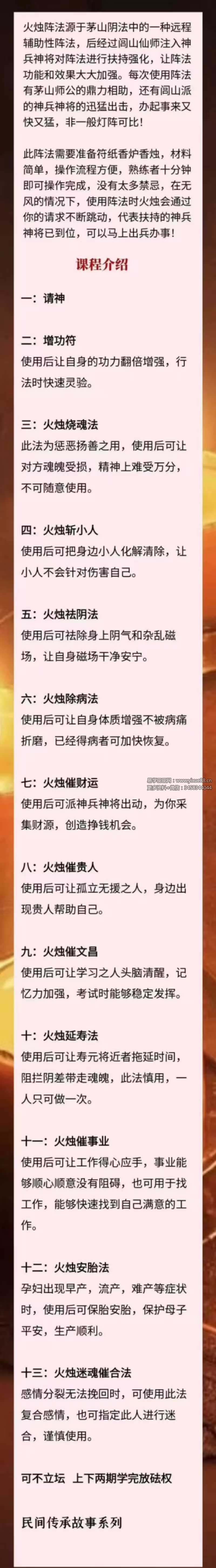 火烛阵法源于茅山阴法中的一种远程辅助性阵法,后经过闾山仙师注入神兵神将对阵法进行扶持强化,让阵法功能和效果大大加强。每次使用阵法有茅山师公的鼎力相助,还有闾山派的神兵神将的迅猛出击,办起事来又快又猛,非一般灯阵可比!